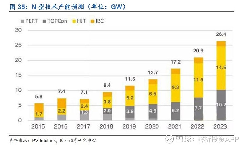 目前全球HIT電池規(guī)劃產(chǎn)能已超15GW,但實(shí)際產(chǎn)能在3-4GW左右。根據(jù)PV InfoLink預(yù)測,預(yù)計(jì)到2023年N型電池產(chǎn)能將達(dá)到26.4GW,而HIT電池產(chǎn)能將達(dá)到14.5GW,相比2018年HIT 產(chǎn)能提升約4倍。